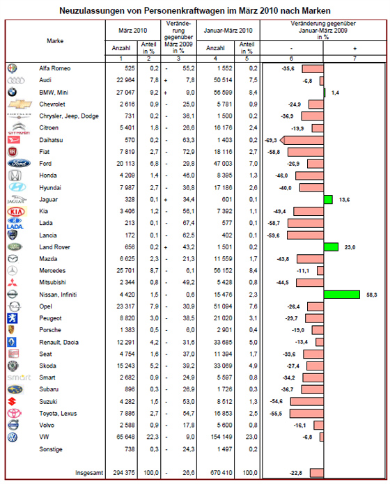 Nur wenige Hersteller können in der Quartalsbilanz eine Aufwärtsbewegung vorweisen. Bei den deutschen Marken gelang es nur BMW (+1,4 %). Besonders hohe Einbußen mussten Opel (-26,4 %), Ford (-26,9 %) und Smart (-34,2 %) hinnehmen. Bei den Importmarken fiel der Rückgang bei Daihatsu mit -69,3 Prozent am stärksten aus. Nissan startete dagegen 2009 schwach und konnte mit 15.000 Zulassungen in den ersten drei Monaten 2010 die Quote deutlich erhöhen (+58,3 %). Die erfolgreichsten Modelle im Hause Nissan sind Micra und Qashqai. Die Hersteller Land Rover (+23,0 %) und Jaguar (+13,6 %) lagen ebenfalls im Plus.