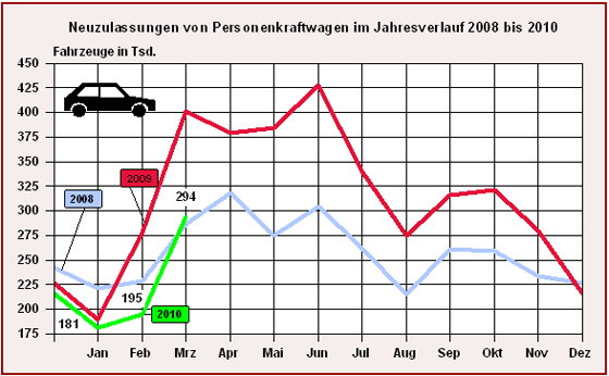 294.375 Personenkraftwagen (Pkw) wurden im März neu zugelassen, das sind -26,6 Prozent weniger als im zulassungsstarken Vorjahresmonat, jedoch +2,7 Prozent mehr als 2008. Nach dem ersten Quartal 2010 steht die Zulassungsbilanz bei 670.410 Pkw (-22,8 %). Nach der großen Nachfrage nach kleinen preiswerten Fahrzeugen im vergangenen Jahr mit der Umweltprämie zeichnen sich im ersten Quartal deutliche Veränderungen ab.