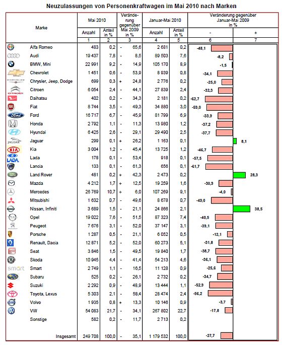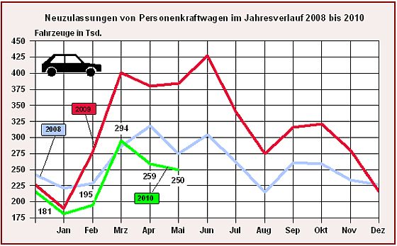 Mit 249.708 neuen Personenkraftwagen (Pkw) war das Zulassungsergebnis im Mai deutlich niedriger als im Vorjahr (-35,1 %). Auch die Zulassungen vom Mai 2008 wurden nicht erreicht (-9,3 %). Nach fünf Monaten liegt das Defizit zum Vorjahr bei über 450.000 Pkw.