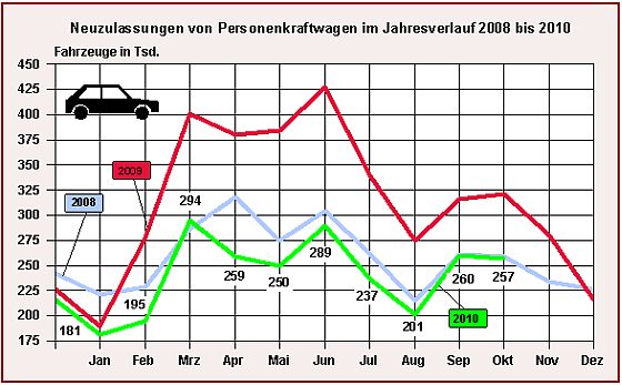 Die monatlichen Neuzulassungen kehren wieder auf Normalniveau zurück. 256.775 fabrikneue Personenkraftwagen (Pkw) wurden im Oktober für den Straßenverkehr zugelassen. Damit wurde, wie schon im September, die Monatsrate von 2008 in etwa erreicht (-0,8 %). Gegenüber dem erhöhten Vorjahresergebnis sind es jedoch 20 Prozent weniger. Bisher wurden 2010 insgesamt 2,42 Millionen Pkw neu zugelassen. Pkw bis zur Kompaktklasse, die im vergangenen Jahr großen Zuspruch hatten, weisen im Oktober erneut hohe Minusraten auf.