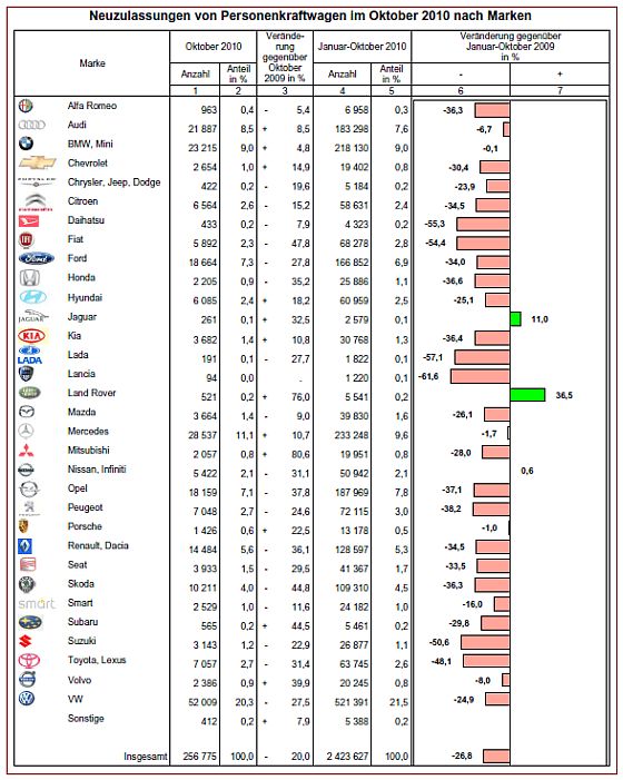 Zweistellige Minusraten gegenüber dem Vorjahr mussten Opel, Ford, VW und Smart hinnehmen. Bei den Importeuren gingen Fiat und Skoda mit den größten Einbußen in die Monatsbilanz ein. Mitsubishi (+80,6 %) und Land Rover (+76,0 %)können dagegen deutliche Aufwärtsbewegungen aufweisen.