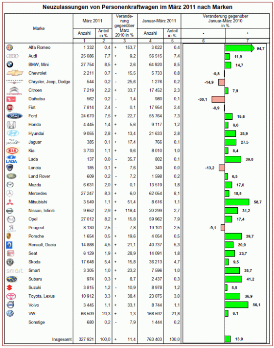 Die erste Quartalsbilanz 2011 bringt ein positives Ergebnis hervor. 763.403 Neuwagen sorgten für ein Zulassungsplus von 13,9 Prozent. Die meisten Automobilhersteller sind auf Wachstumskurs. Bei den deutschen Marken fährt Porsche (+39,7 %), gefolgt von Smart (+35,7 %), vorne weg. Ford (+18,6 %) und Opel (+17,4 %) hatten die nächst höheren Zugewinne. Die meisten Zulassungen an Importfahrzeugen gab es erneut bei Renault/Dacia (+20,9 %). Sie konnten ihre Führungsposition gegenüber Skoda (+9,5 %) behaupten. Deutliche Zugewinne gab es bei den nächstplatzierten Toyota (+36,9 %), Hyundai (+25,9 %) und Nissan (+31,2 %). Peugeot (-9,1 %) fiel auf Rang sechs zurück.