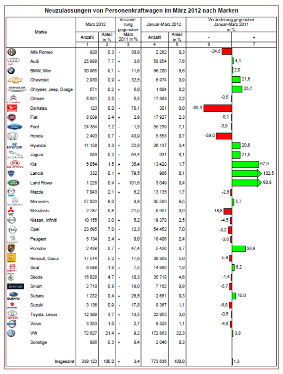 339.123 Personenkraftwagen (Pkw) beleben den Neuzulassungsmarkt zum Saisonauftakt. Das sind +3,4 Prozent mehr als im März 2011. Nach dem ersten Quartal 2012 zeigt die Zwischenbilanz mit 773.636 Neuwagen ein leicht erhöhtes Ergebnis zum Vorjahr (+1,3 %). 38,4 Prozent der Pkw wurden auf private Halter zugelassen. Der Dieselanteil lag bei 47,9 Prozent. 4.020 Fahrzeuge waren mit Hybrid- und 694 mit reinem Elektro-Antrieb ausgerüstet. 3.066 Pkw verfügten über einen Gasantrieb. Der durchschnittliche CO2-Wert sank auf 143,6 g/km.