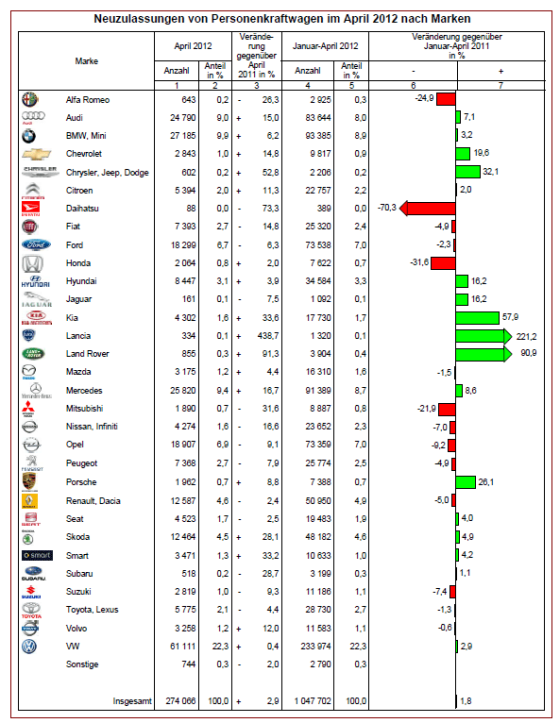 Bis auf Ford (-6,3 %) und Opel (-9,1 %) konnten alle deutschen Marken Zugewinne gegenüber dem Vorjahr verbuchen. Smart kann mit +33,2 Prozent den höchsten Zuwachs vorweisen. Bei den Import-Marken lagen Renault (einschließlich Dacia) und Skoda mit den meisten Neuzulassungen fast gleichauf (siehe Diagramm). Land Rover (+91 %) und Lancia (+439 %) erzielten die höchsten Zulassungssteigerungen.