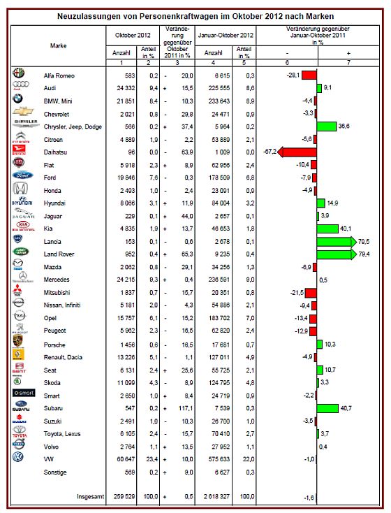 Mit 259.529 Personenkraftwagen (Pkw) gab es am Neuzulassungsmarkt im Oktober 2012 einen leichten Anstieg gegenüber dem Vorjahr(+0,5 %). Bisher wurden im Jahr 2012 insgesamt 2,62 Millionen neue Pkw für den Straßenverkehr zugelassen, -1,6 Prozent weniger als im Vergleichszeitraum 2011.