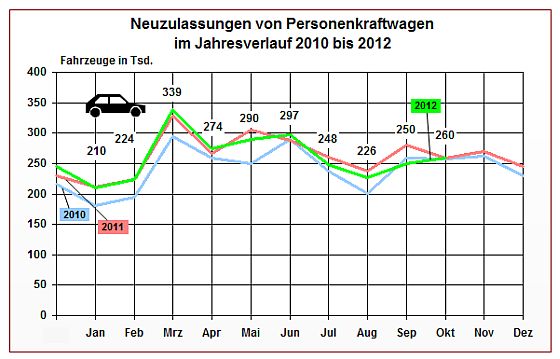 Mit 259.529 Personenkraftwagen (Pkw) gab es am Neuzulassungsmarkt im Oktober 2012 einen leichten Anstieg gegenüber dem Vorjahr(+0,5 %). Bisher wurden im Jahr 2012 insgesamt 2,62 Millionen neue Pkw für den Straßenverkehr zugelassen, -1,6 Prozent weniger als im Vergleichszeitraum 2011.
