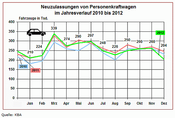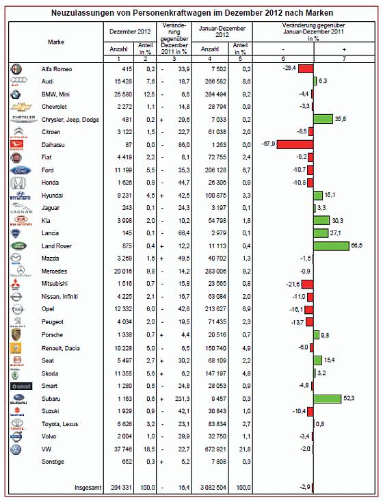 204.331 Personenkraftwagen wurden im Dezember 2012 neu zugelassen, das sind 16,4 Prozent weniger als im Dezember 2011. In der Jahresbilanz 2012 stehen insgesamt 3,08 Millionen Neuwagen. Das sind 2,9 Prozent weniger als 2011, ein Rückgang um rund 91.000 Fahrzeuge.