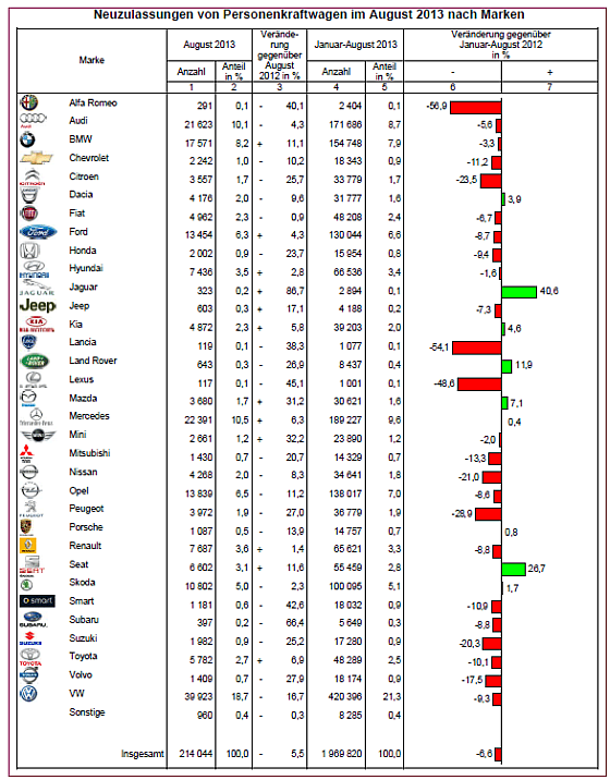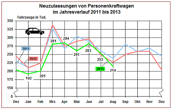 Mit 214.044 neu zugelassenen Personenkraftwagen (Pkw) lag der August 2013 um – 5,5 Prozent unter dem Vorjahreswert. 61,5 Prozent der Neuwagen wurden gewerblich zugelassen. Die ersten acht Monate des Jahres zeigten mit insgesamt 1.969.820 Neuwagen ein Minus von 6,6 Prozent.