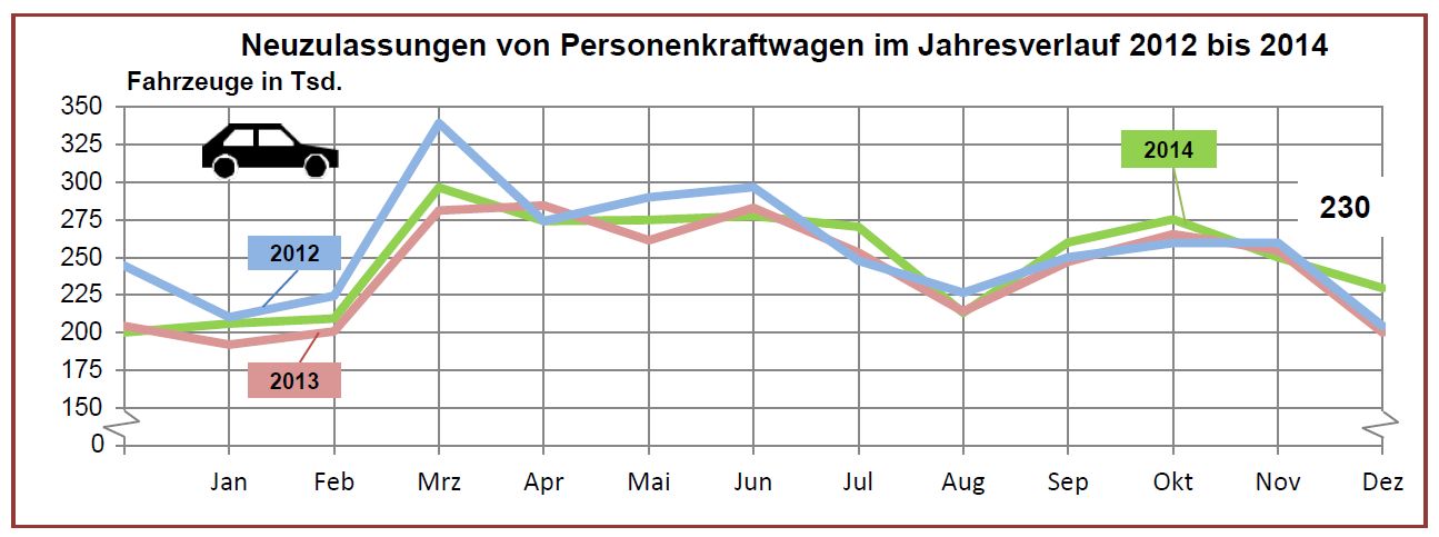 Die Jahresbilanz 2014 schloss mit insgesamt 8,02 Millionen (+0,3 %) umgeschriebenen Kfz und rund 355.000 Kfz-Anhängern (+6,2 %).