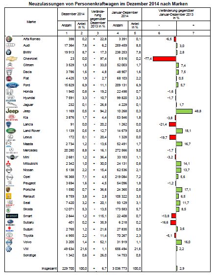 229.700 Personenkraftwagen (Pkw) wurden im Dezember 2014 neu zugelassen, +6,7 Prozent mehr als im Dezember 2013. In der Jahresbilanz stehen somit insgesamt 3,04 Millionen Neuwagen. Das sind +2,9 Prozent mehr als 2013.