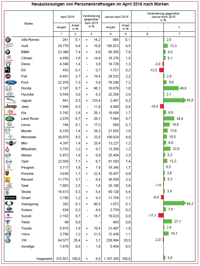 Alle deutschen Marken erzielten im April Zugewinne. Mini wies mit einem Plus von +25,4 Prozent die größte Steigerung zum Vorjahresmonat auf. Auch Porsche (+22,4 %) und Mercedes (+22,0 %) erreichten deutliche Zuwächse. Anteilsstärkste deutsche Marke war VW (20,4 %). Bei den Importmarken zeigten sich bei Jaguar (+125,4 %), Honda (+90,1 %) und Ssangyong (+80,5 %) deutliche Zuwächse. Anteilsstärkste Importmarken waren Skoda (5,3 %), Renault (3,7 %) und Hyundai (3,0 %).